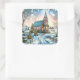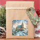 Christmas stickers with a beautiful watercolor church, Christmas trees and snowy grounds and sparkles.