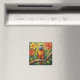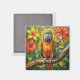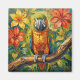 A sweet magnet with an impasto painting style parrot and colorful coral and yellow tropical flowers.