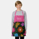 This bold, colourful kids' apron features a hand drawn floral design in magenta / fuchsia pink, orange, golden yellow, purple, blue, and green over a custom colour background (shown in black). A text template is included for personalisation, making this apron a great gift for any special occasion or holiday!