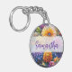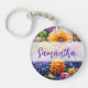 Personalised key ring. Pretty flowers in orange, purple, blue and yellow with green foliage. Pretty ai art.