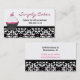 Elegant custom bakery business card done with a black and white damask design at the bottom of the card, and solid white, at the top. A stylish black, white, and pink cupcake, with cherry on top, decorates the left front of the card. Text in pink and black is fully customisable to suit your business needs. Perfect for a bakery shop, party shop, or an independent custom baker.