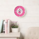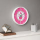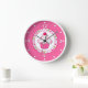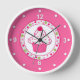 Whimsical pink, green, and white wall clock, with graphics of a cupcake inside a polka dot circle. Number and dots are done in white. Customise to add any text you want. Makes a great gift idea.