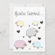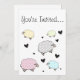 An invitation featuring a cute black heart and pastel polkadot sheep design.