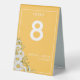 Pretty wedding table numbers design features watercolor white daisies corner on daffodil yellow background with white customisable text blocks in modern fonts