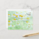 Postcard with a fresh and summery photograph featuring a collection of wild daisies with big yellow centres growing in a green field.