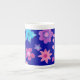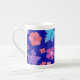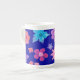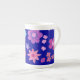A pretty Bone China Mug to personalise, with a pattern of flowers in purple, turquoise, pink and orange on a dark blue background, from a handpainted paper collage by Judy Adamson.