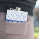 Pretty drinking flask done in a blue on blue damask pattern, with graphics of a white lace overly, on the top half of the flask. Graphics of a blue satin looking ribbon, with white edelweiss flowers, runs across the middle. Personalise the white text, on the front, for yourself or as a charming gift idea.