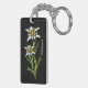 Lovely key chain with graphics of the white Alpine flower called Edelweiss, set on a black background. White custom text, running up the left side, is ready to personalise. Great gift idea.