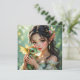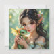 A pretty anime elven fairy holding her cute green and gold baby dragon blank card.
