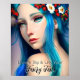 Dream Big and Live Your Fairy Tale quote. Pretty enchanted fairy girl with blue hair and red and white flowers in her hair and blue eyes. Fantasy art ai art. generativecontent