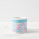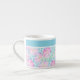 A very pretty little Espresso Coffee Mug, with a pattern of pink roses on a sky blue background, dotted with white butterflies: from a handpainted watercolour design by Judy Adamson. You can add text to the plain band at the top or just leave it plain.