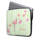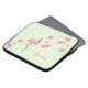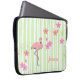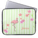 Pretty laptop cover done in a white and light green striped pattern. Graphics of pink flamingo and colourful pink and peach flowers decorate the striped background. Pink script text, on the bottom, is ready to personalise with your name. Makes a great gift idea. Chose the size you need.