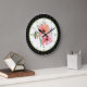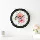 Pretty black and white polka dot wall clock, with a green and white circle, in the middle, with gorgeous watercolor painted flowers. Green hour marks, run around the edge of the white circle. Customize to add your own text to the lovely clock.