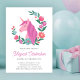 Create a magical birthday party for your little girl with this beautiful invitation, featuring a hand drawn unicorn with a floral wreath in shades of pink, purple, aqua blue, blush pink, and emerald green. The back contains a speckled design in white over a light pink background. All text / text colours can be customised, if desired.