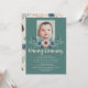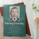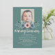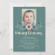 Invitation for a naming ceremony featuring a bouquet of pink and blue roses framing the photo of your beautiful little girl. Naming ceremony is written in a large bold hand-lettered font. The back features a seamless pattern of flowers and leaves.