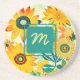 Yellow and turquoise whimsical folk art flowers coaster. Add initials in the personalised area.