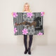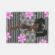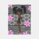 A super cute blanket with bold black and white stripes. A super cool and retro abstract pattern and a beautiful and pretty young cartoon girl.