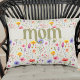 Mum pillow in soft green with colourful wildflower pattern and bold modern lettering. The design features pretty wild flowers with "mum" lettered in ornate typography. Please browse my Mother's Day Wildflower Collection for more flowery cards and gifts.