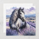 Blank greeting card. Pretty white and grey horse standing in a pretty field of lavender. This was created with ai and done in a watercolor style.