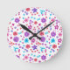 A pretty, round Wall Clock, with a pattern of flowers in purple, turquoise, pink and orange on a white background, from a handpainted paper collage by Judy Adamson. You can easily change the background colour by using the Edit button.