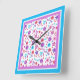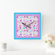A pretty, square Wall Clock, with a pattern of flowers in purple, turquoise, pink and orange on a white background with a lavender and turqoise border, from a handpainted paper collage by Judy Adamson. You can easily change the background colour by using the Edit button.