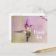 Pretty thank you postcard featuring a pink anna's hummingbird flying against a purple and green background, looking up and posing with its wings outstretched joyfully. Next to him "Thank You" is written in modern white typography. Beautiful thank you card for bird, garden and nature lovers. Photo taken in Arcadia, California.
