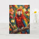 A blank card that you can write your own message in. On the front is an impasto painting style colorful red, blue and yellow Macaw and flowers.
