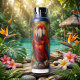 A bird themed water bottle with an impasto painting style colorful red, blue and yellow Macaw and flowers.