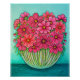 A stylised, vibrant floral painting of cosmos in many shades of pink in a glass vase on a turquoise background Print by popular artist Lisa Lorenz