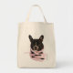 october is breast cancer awareness month. show your support with these canvas totes. betty, a french bulldog, models a pink ribbon wrapped around her