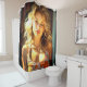 This shower curtain has a pretty lady pictured on it.