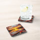 Coasters with a pretty illustration of a sunrise in the morning overlooking a lake view at a lake houses with a cup of warm coffee sitting on the ledge.