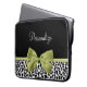 Personalise by adding the name of any girly girl to this pretty black and white leopard print 15'' neoprene laptop sleeve with a cute spring green ribbon tied into an elegant bow. This chic and stylish animal print design is a flat printed image, and does not contain actual ribbon.