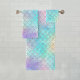 Pretty mermaid scales bath towel set in pink, blue and purple mermaid pattern with faux glitter.