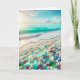 Anniversary card. Beautiful colourful sea glass on a white sandy beach with turquoise waves ocean scene.