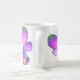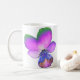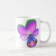 This coffee mug features a photograph of a wild Pansy flower. The photo has been artificially coloured resulting in a pansy with glowing pinkish purple petals with green tips petals and a deep blue centre. The flower is on both sides of the mug. The design is shown here on a basic white coffee mug, but is also available on other styles and colours of mugs, including stunning frosted glass mugs and useful travel mugs.