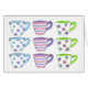 Greeting card features an original marker illustration of a row of pretty pastel-coloured tea cups.