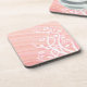 This coaster is adorned with a pink shadowed white filigree and floral design over a computer generated fractal background of pink and peach coloured spirals. Click the orange Customise it! button to add text like surname, quote or whatever you'd like in a font, style, size and colour you choose.