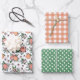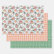 Beautiful peach-themed wrapping paper sheets with three matching patterns in peach, white, and green. One features a pretty hand-drawn peach and peach blossom pattern, one features peach gingham, and one features green and white polka dots.
