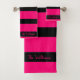 Stylish and chic, this bath towel set features a pink and black striped theme. Your personalised text is print on the lower right hand corner of each item. This set includes a wash cloth, hand towel, and bath towel which can be purchased together or separately.