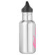 This awesome water bottle features a digital art image of a pretty pink cat with a curly tail. Her eyes are pale pink with black pupils and she has long black eyelashes. She is wearing a pink bow in her hair and a beautiful pearl necklace around her neck.