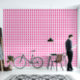 This awesome nursery wallpaper features a digital art image of a pretty pink cat with a curly tail. Her eyes are pale pink with black pupils and she has long black eyelashes. She is wearing a pink bow in her hair and a beautiful pearl necklace around her neck.