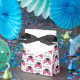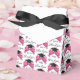 Girly graduation favour boxes printed with a pattern of a pretty pink bow and a graduation cap with a matching pink tassel, the year, and thank you in a black script.