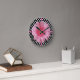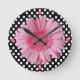 Pretty decorative wall clock done in a black and white polka dot pattern. A pink graphically enhanced Gerber daisy bloom, decorates the middle, and four pink buttons denotes the quarter hours. Customise to add any text you might want. Stylish clock that makes a great gift idea.
