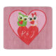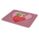 A good glass cutting board, this item is a kitchen essential. Protect your counter tops with this stylish board. Made especially for couples this board features a pink background and a pink heart with two owls inside the design. There are red hearts visible on the chest where the owl's hearts is. Underneath the owls is another red heart. Inside of that heart is a place to insert couple's initials. Order yours today!