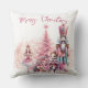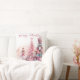 This custom throw pillow features a pretty pink Nutcracker Christmas theme on a plain white background. Characters from the Nutcracker story are pictured around a pink coloured Christmas tree. The Sugar Plum Fairy ballerina is pictured on the left, and the giant Nutcracker and Mouse King are pictured on the right. A sample "Merry Christmas" greeting is printed above the illustration which you can personalise to include your own greeting, custom name or other text.