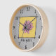 This is a beautifully designed clock that you can personalise with your name. It features a pen and ink drawing of a pink rose. The rose has a yellow background inside a black line border. The background colour is pale grey, and the clock has black numbers with a pale wood surround. The artwork is original, and only available from The Art of Being Beth.
