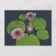 A brown dragonfly hovers over a pink water lily surrounded by lily pads on a calm blue pond.