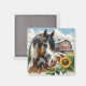 Pretty magnet with a brown, black and white spotted horse surrounded by sunflowers and a rustic red barn in the background. Cute for a farmhouse or rustic theme or for anyone who loves horses.