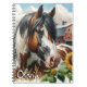 Pretty personalised notebook with a brown, black and white spotted horse surrounded by sunflowers and a rustic red barn in the background.